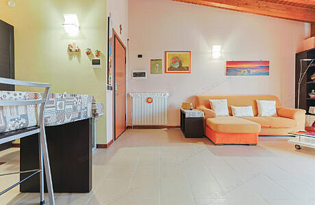 La zona giorno è caratterizzata da una moderna cucina a vista, perfetta per chi ama ambienti aperti e conviviali.