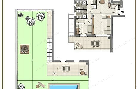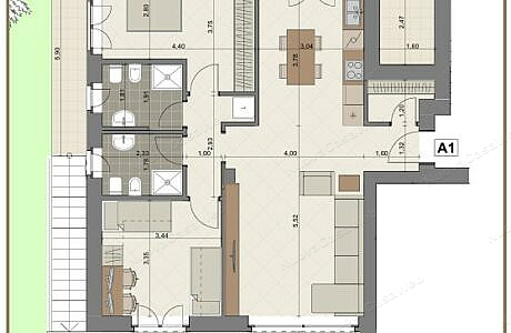 Appartamento “A1” posto al piano rialzato composto da ingresso, ripostiglio/lavanderia, ampio soggiorno con cucina abitabile con accesso terrazzo, spaziosa camera matrimoniale, ampia seconda camera, doppi servizi entrambi con finestra e secondo terrazzo. Completa la proprietà l’ampio giardino privato con patio coperto. Cantina inclusa nel prezzo. Disponibilità di box singolo o doppio.