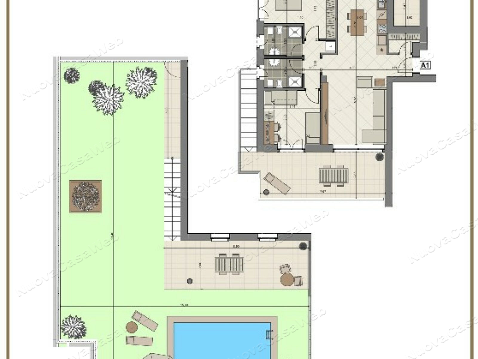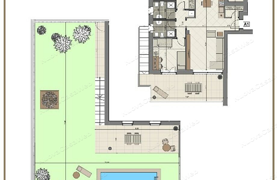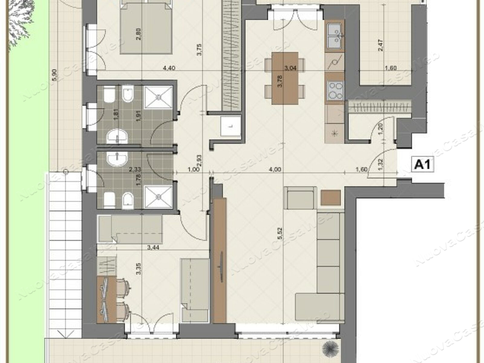 Appartamento “A1” posto al piano rialzato composto da ingresso, ripostiglio/lavanderia, ampio soggiorno con cucina abitabile con accesso terrazzo, spaziosa camera matrimoniale, ampia seconda camera, doppi servizi entrambi con finestra e secondo terrazzo. Completa la proprietà l’ampio giardino privato con patio coperto. Cantina inclusa nel prezzo. Disponibilità di box singolo o doppio.