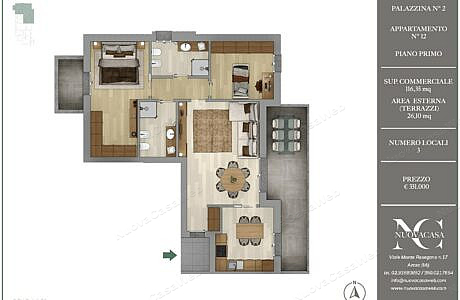Appartamento “B12” posto a piano primo e costituito da ingresso con vestiere, ampio soggiorno con accesso diretto al terrazzo di 26 mq, cucina abitabile anch’essa con accesso al terrazzo, disimpegno zona notte, bagno padronale finestrato con doccia, bagno di servizio con doccia, ampia camera matrimoniale con cabina armadio e balcone, spaziosa seconda camera. Disponibilità di cantine e box singoli o doppi da abbinare alla proprietà.
